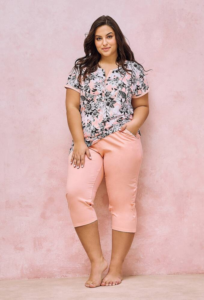Piżama damska uszyta z wysokiej jakości bawełny . Koszulka z krótkim rękawem, dekolt półokrągły zapinany na guziki