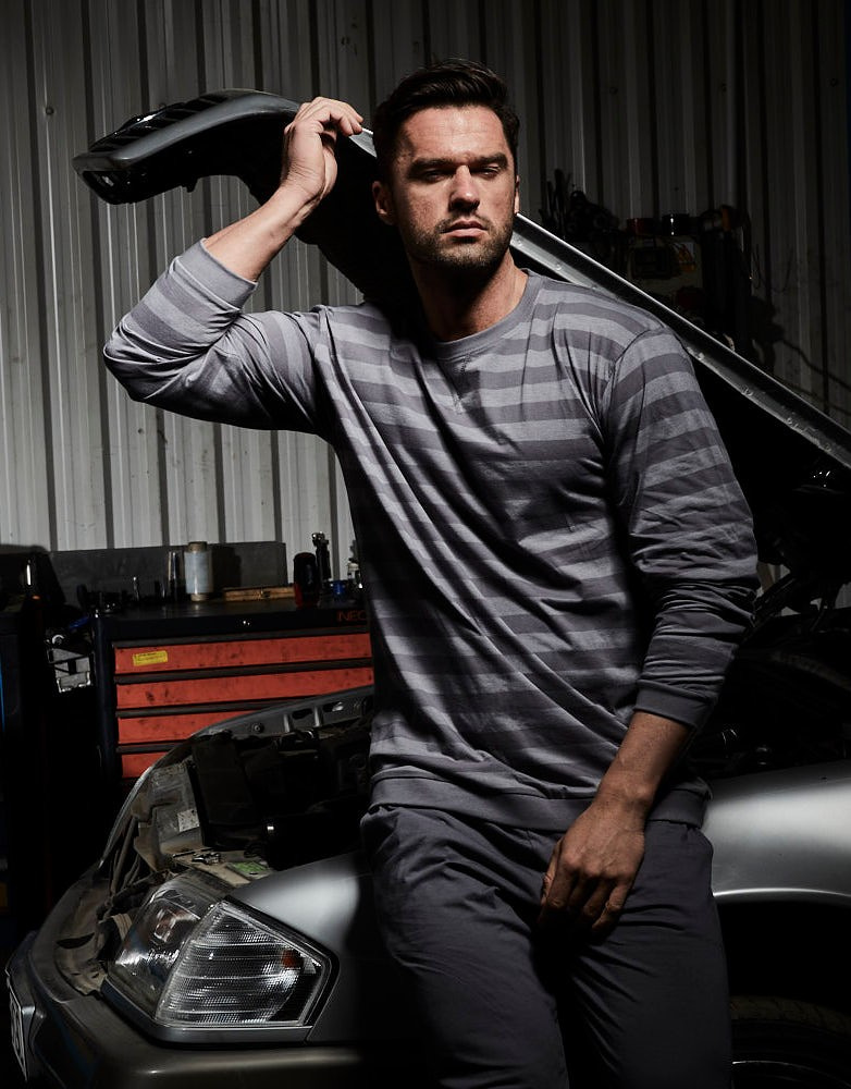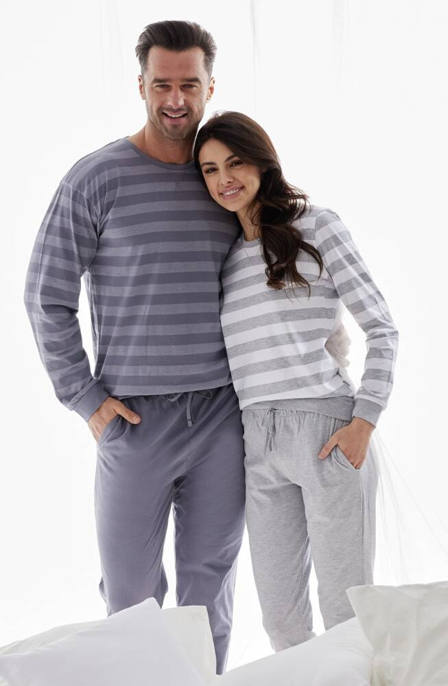 Piżama męska wykonana z wysokiej jakości bawełny. Koszulka z długim rękawem, w paski. Do kompletu długie jednolite spodnie zakończone ściągaczem.