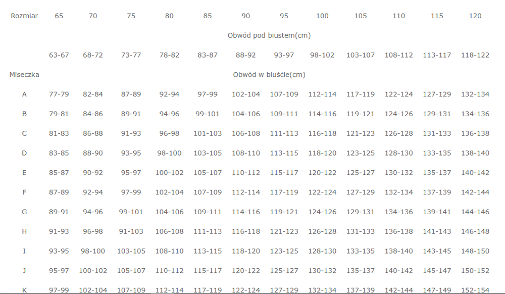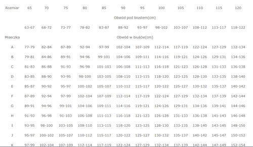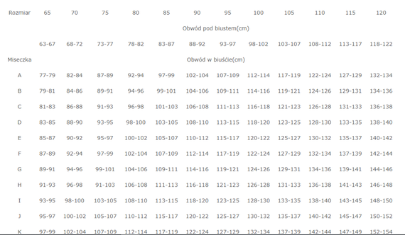 | Rozmiar | Obwód pod biustem | Obwód w biuście |
