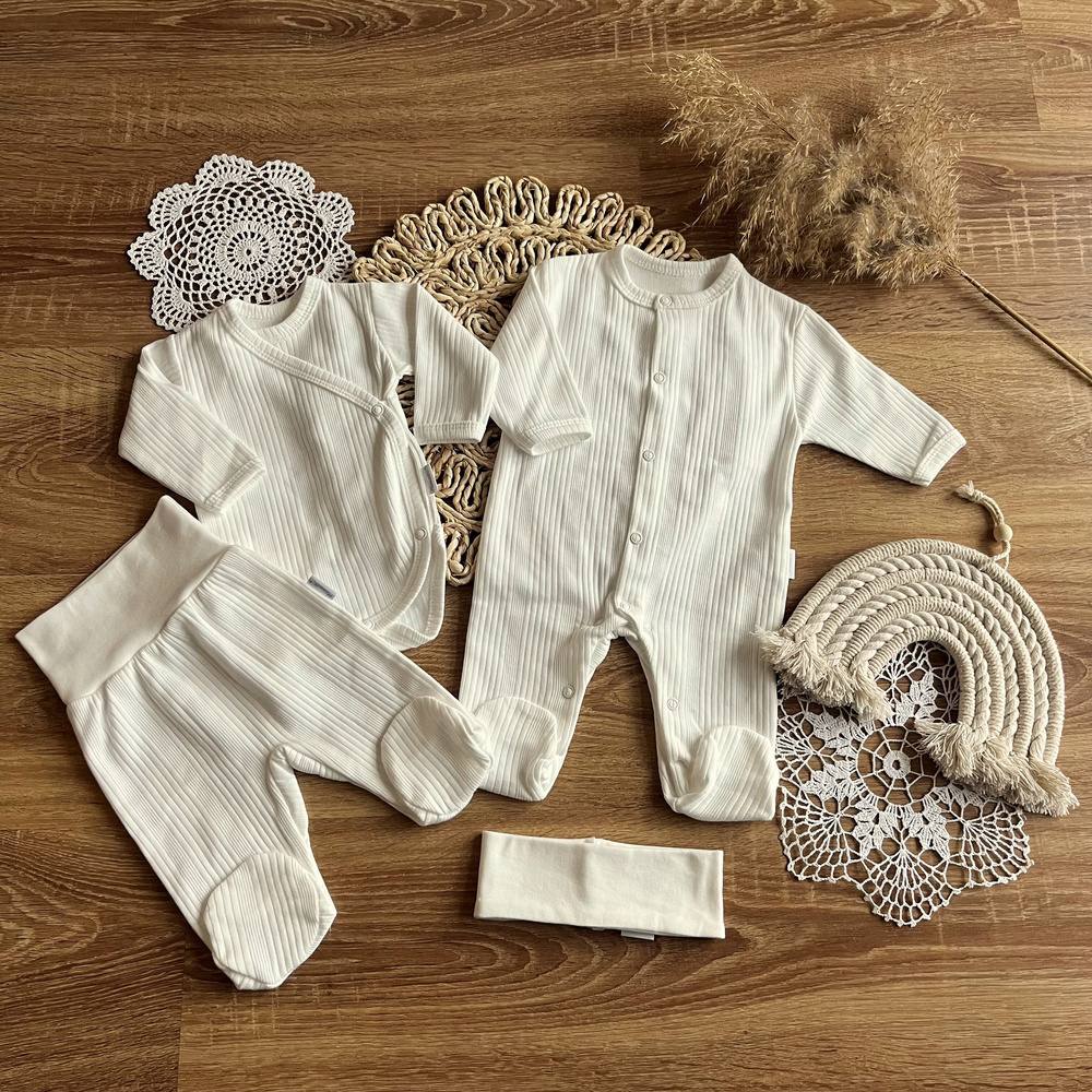 Wygodna 4 częściowa wyprawka niemowlęca to podstawowy element garderoby każdego maluszka. Produkty wykonane są z dzianiny 100% bawełna z certyfikatem Bezpieczne dla Dziecka oraz Tekstylia Godne Zaufania. W jej skład wchodzi: body, półśpiochy, pajac, opaska.
