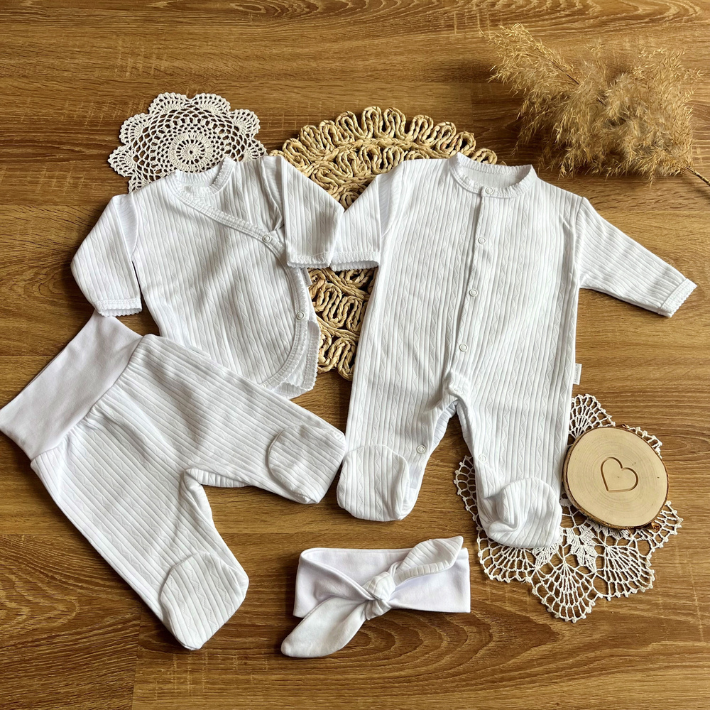 Wygodna 4 częściowa wyprawka niemowlęca to podstawowy element garderoby każdego maluszka. Produkty wykonane są z dzianiny 100% bawełna z certyfikatem Bezpieczne dla Dziecka oraz Tekstylia Godne Zaufania. W jej skład wchodzi: body, półśpiochy, pajac, opaska.