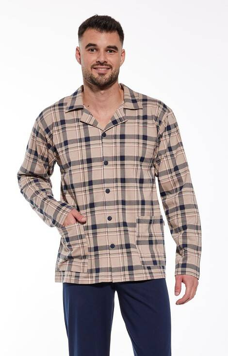 Klasyczna piżama męska uszyta z delikatnej bawełny w kratę. Piżama z długim rękawem, rozpinana, na wysokości bioder kieszenie. Do kompletu długie spodnie z prostymi nogawkami. Piżama pakowana w pudełko.