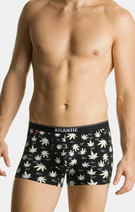 Bokserki o sportowym kroju- niska talia i uniwersalnej długości nogawki. Idealne dopasowanie do sylwetki. Zabawny nadruk w liście konopi.