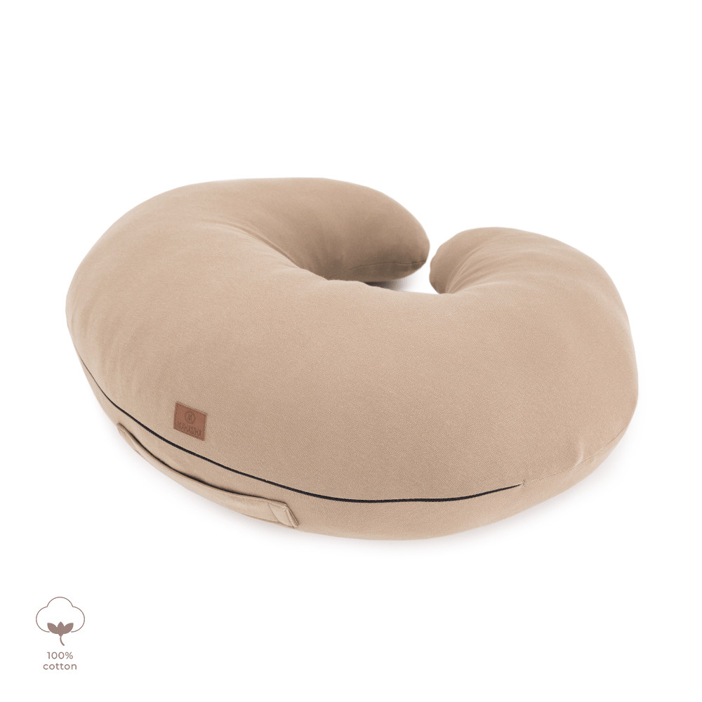 Rogal wykonany jest obustronnie z najwyższej jakości dzianiny bawełnianej, która nie spiera się i nie traci swoich właściwości nawet po wielokrotnym praniu. Poszewka zapinana na bezpieczny suwak jest łatwa do zdjęcia z poduchy i wyprania. W środku bawełniany rogal wypełniony antyalergicznym puchem silikonowym zapewniającym miękkość, a także sprężystość. Wewnętrzna część zapinana jest na niewielki suwaczek dający możliwość regulacji ilości wypełnienia. Dzięki temu poducha idealnie dopasowuje się kształtem i rozmiarem do maluszka i osoby karmiącej.