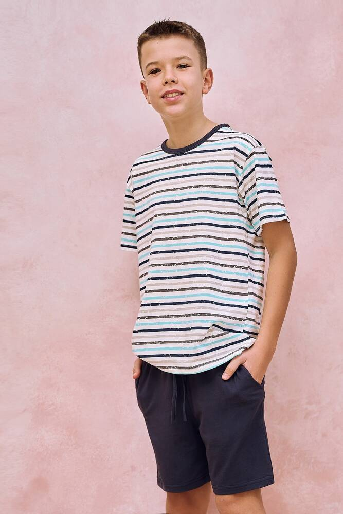 Koszulka z krótkim rękawem z nadrukiem, dekolt okrągły. Spodnie krótkie z kieszeniami