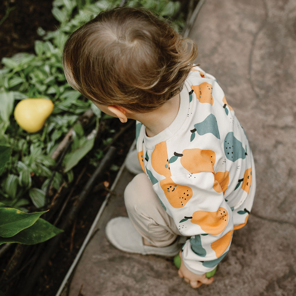 Bluza dresowa uszyta z miękkiej i przyjemnej w dotyku dzianiny dresowej z nadrukiem gruszek.