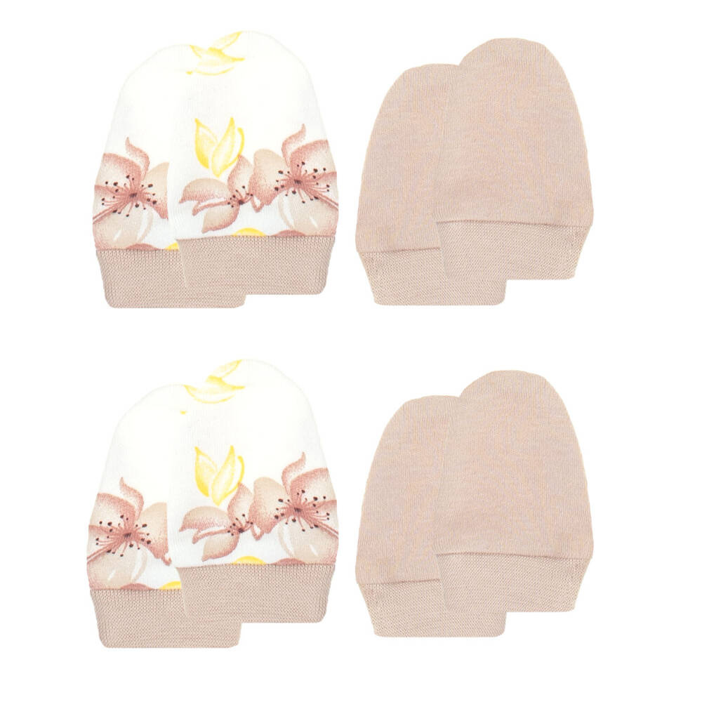 Zapytaj o produktRękawiczki, niedrapki 4 - pack uszyte ze 100% bawełny, posiadającej certyfikat Oeko-Tex Standard 100 Tekstylia godne zaufania. Występują w dwóch wersjach kolorystycznych. Pierwsze w kolorze beżowym, drugie kremowe w kwiatowy wzór. Modele posiadają bezuciskowy ściągacz. Rękawiczki zabezpieczają noworodka przed zadrapaniem się.