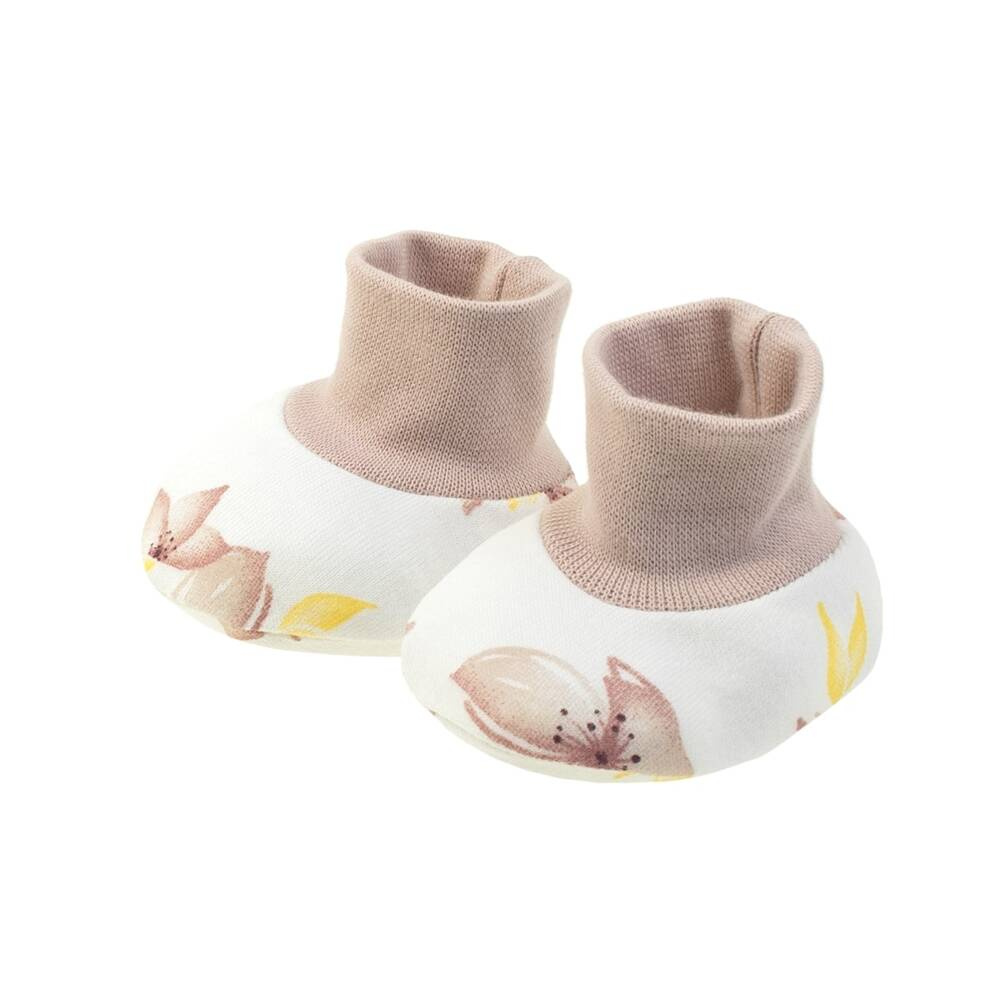 Zapytaj o produktBuciki z kolekcji Lou uszyte ze 100% bawełny w kolorze kremowym w kwiatowy wzór. Materiał całkowicie bezpieczny dla skóry dziecka. Butki zostały wykończone bezuciskowym ściągaczem w kolorze beżowym, dzięki czemu nie będą się zsuwać. Idealne od pierwszych chwil życia.