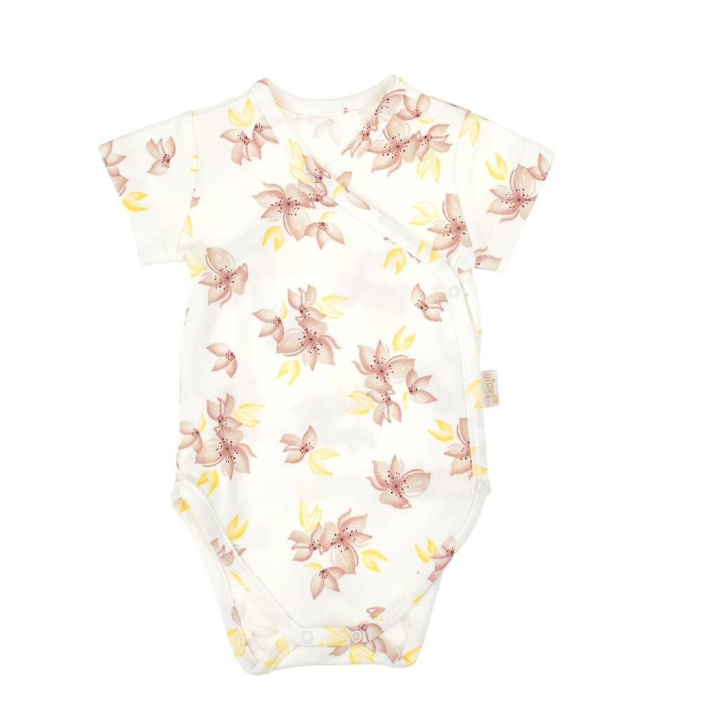 Zapytaj o produktBody kopertowe z krótkim rękawem dla dziewczynki, uszyte z kremowej bawełny w kwiatowy wzór. Model ten polecany jest dla noworodków, ponieważ zastosowane zapięcie kopertowe ułatwia ubieranie dziecka. Zapinane na bezniklowe napy. Materiał posiada certyfikat Oeko-Tex Standard 100 Tekstylia godne zaufania.