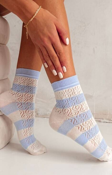 0989-003 Ażur Paski Skarpety damskie ażur Milena - ecru-błękitny