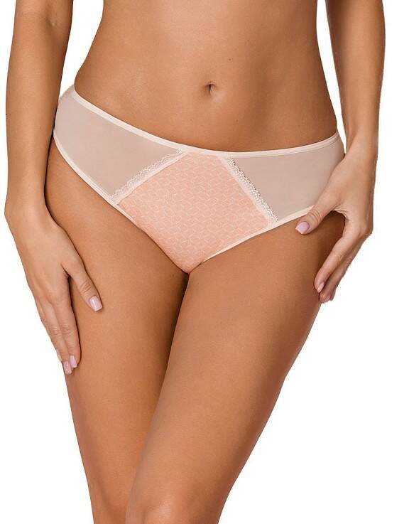 Figi wykonane z dzianiny, koronki oraz tiulu w delikatnym kolorze brzoskwini.