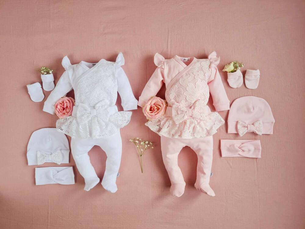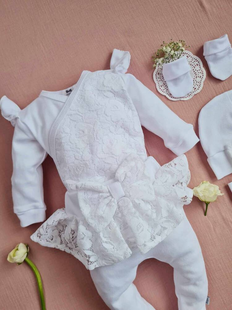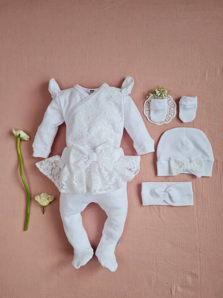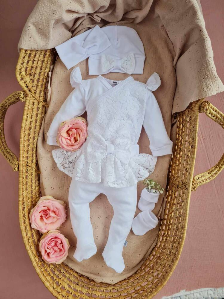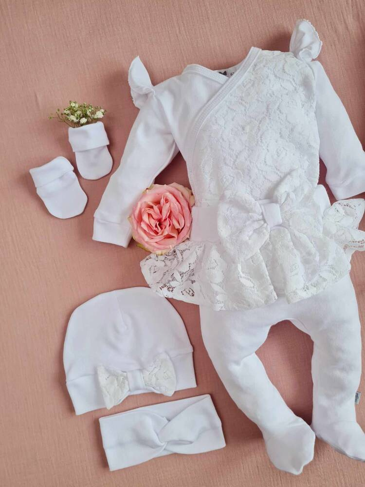 Efektowny biały komplet dla niemowląt. W jego skład wchodzi body kimono z długim rękawem, półśpiochy z ozdobną kokardą, czapeczka, opaska oraz rękawiczki niedrapki. Całość wykonana jest z mięciutkiej bawełny i wykończona delikatną koronką. Doskonale sprawdzi się w pierwszych dniach życia maluszka.
