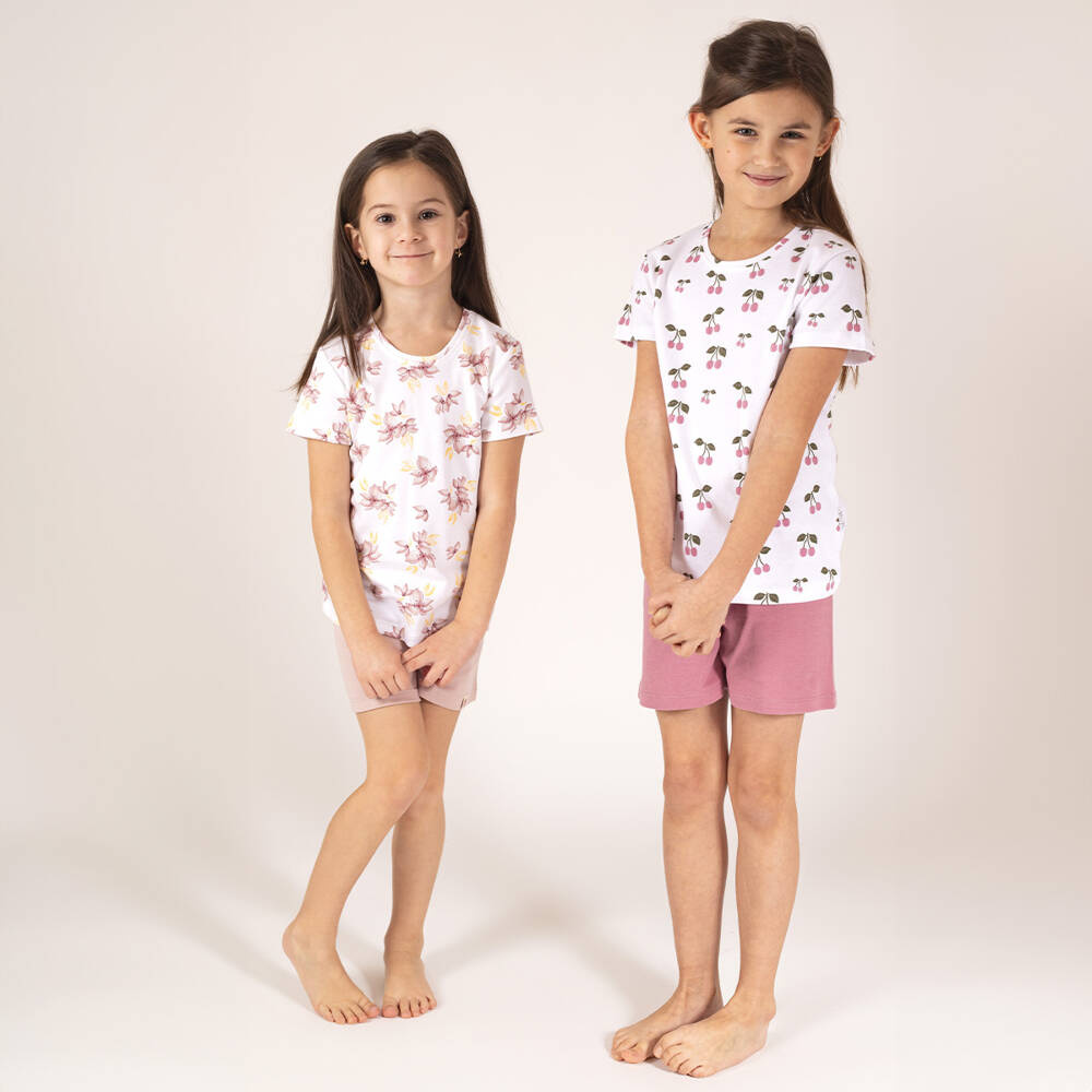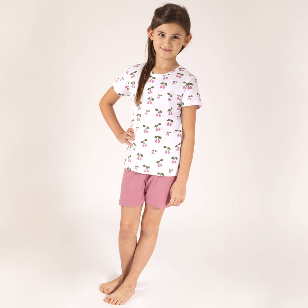Zapytaj o produktBawełniany komplecik z luźną bluzką z krótkim rękawem i krótkimi spodenkami. Góra kompletu wykonana z białej bawełny w wzór wisienek. Dół natomiast uszyty z wrzosowej bawełny. Spodenki posiadają w pasie wygodną gumkę, nie uciskającą brzuszka, dodatkowo została przeszyta, aby zapobiec okręcaniu się. Bawełna, z której komplet jest uszyty, posiada certyfikat Oeko-Tex Standard 100 Tekstylia godne zaufania.