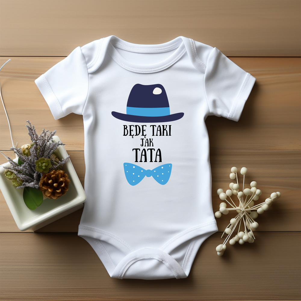 SKU A036 "Będę taki jak tata kapelusz i muszka" Body krótki rękaw Moocha biały