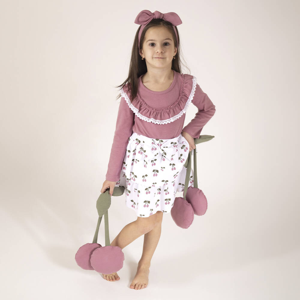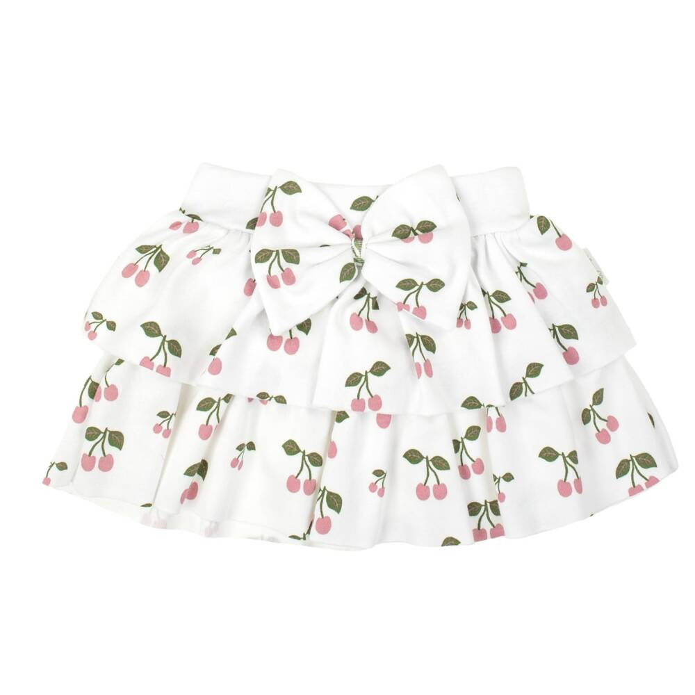 Zapytaj o produktNie krępująca ruchów, wygodna spódniczka wykonana ze 100% białej bawełny w wzór wisienek. Materiał posiada certyfikat Oeko-Tex Standard 100 Tekstylia godne zaufania. W pasie wszyto praktyczną gumkę, ułatwiającą ubieranie. Produkt zdobią dwie marszczone falbanki oraz duża kokarda na przodzie.