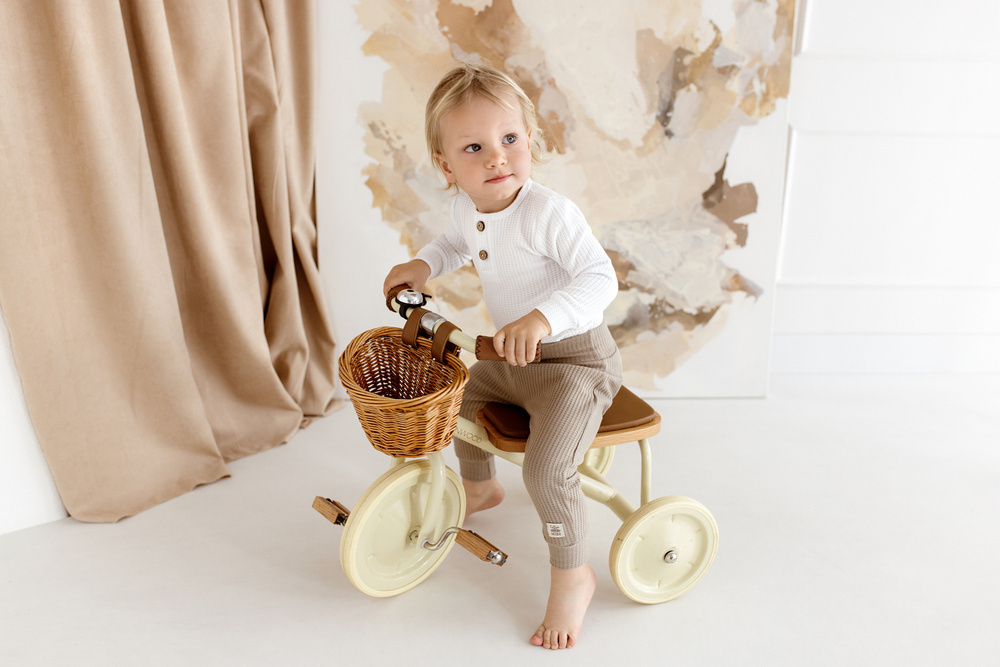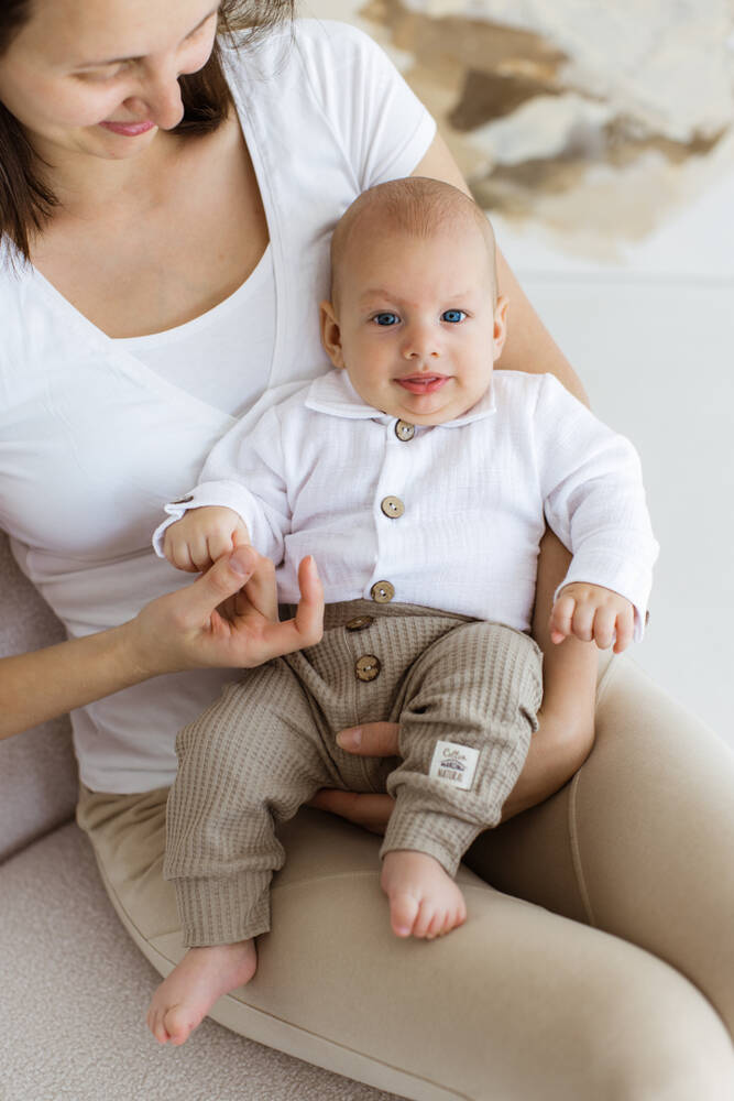 Modne spodnie z dzianiny wafel. Wszyty w pasie nieuciskający ściągacz z gumką, utrzymuje ubranko w odpowiednim miejscu. Swobodny fason spodni zapewni dziecku wygodę w trakcie nauki chodzenia, raczkowania czy zabawy.