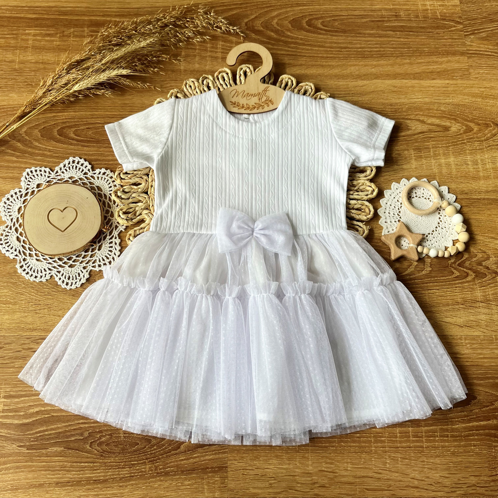 Urocza sukienka z krótki, rękawem. Wykonana z wysokiej jakości materiałów. Dół wykończony delikatnym tiulem. Po środku ozdobna kokarda.