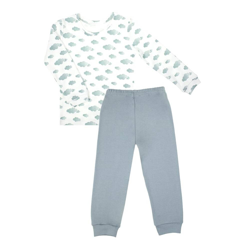Zapytaj o produktBawełniana piżamka na długi rękaw z kolekcji Liam. Bluzka uszyta z drukowanej białej bawełny w lodowe chmurki. Spodnie natomiast wykonane zostały w kolorze lodowym. Posiada certyfikat Oeko-Tex Standard 100 Tekstylia godne zaufania. Fason piżamki jest luźny, będzie idealnie pasował na każdą sylwetkę. Spodnie posiadają w pasie wygodną gumkę, nie uciskającą brzuszka, dodatkowo została przeszyta, aby zapobiec okręcaniu się. Dół nogawek zakończono ściągaczem.