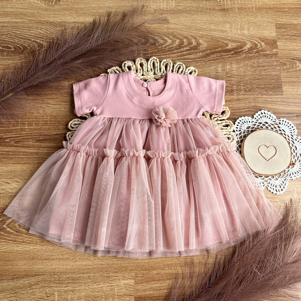 Urocza sukienka z krótkim rękawem. Wykonana w 100% z bawełny. Dół wykończony efektownym tiulem.