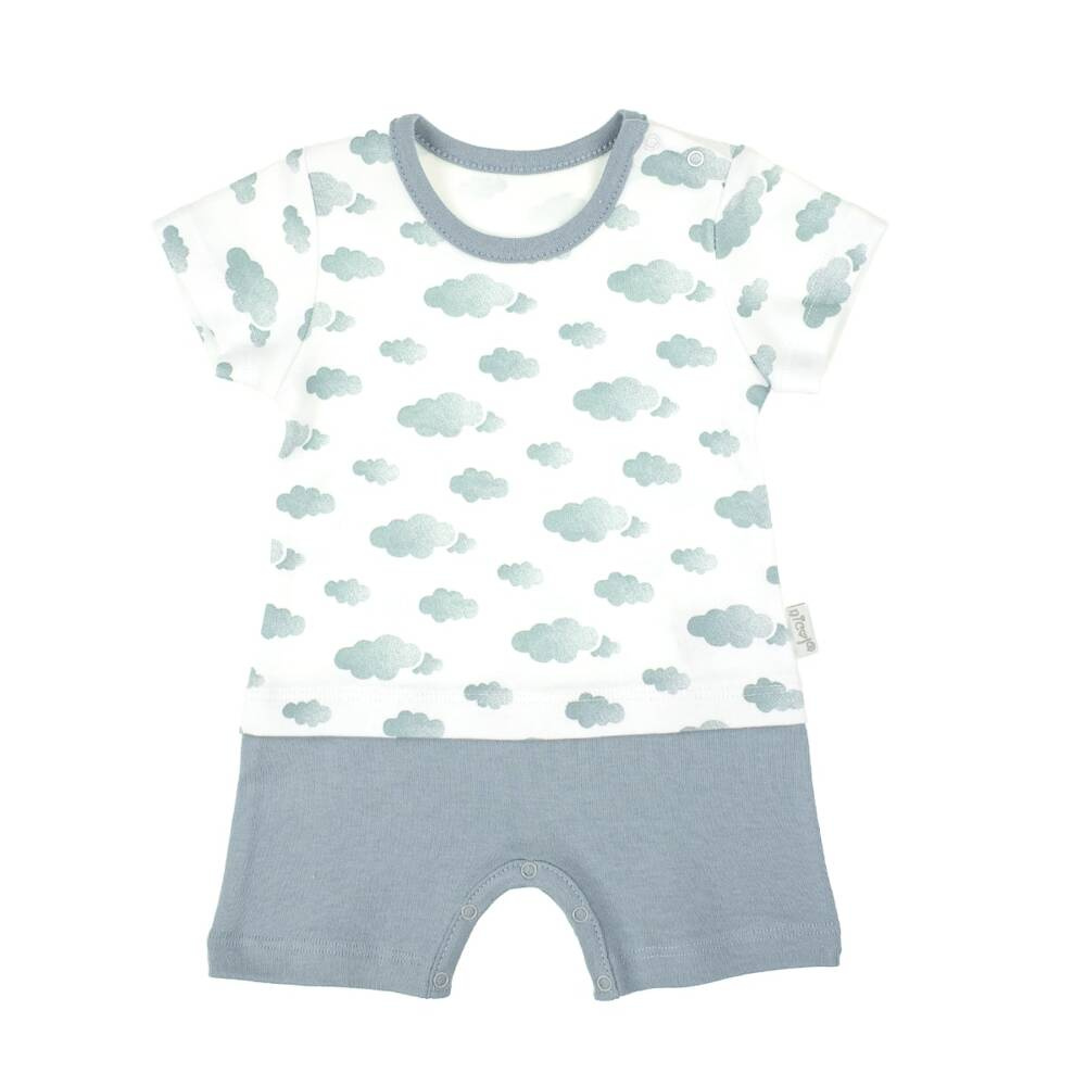 Zapytaj o produktDoskonały w ciepłe dni, rampers, posiada krótkie rękawki i nogawki. Ubranko powstało w połączeniu bluzki z drukowanego materiału w lodowe chmurki i spodenek w kolorze lodowym. Posiada wygodne bezniklowe napy na ramieniu i w kroku ułatwiające przewijanie maluszka. Uszyte ze 100% białej bawełny.