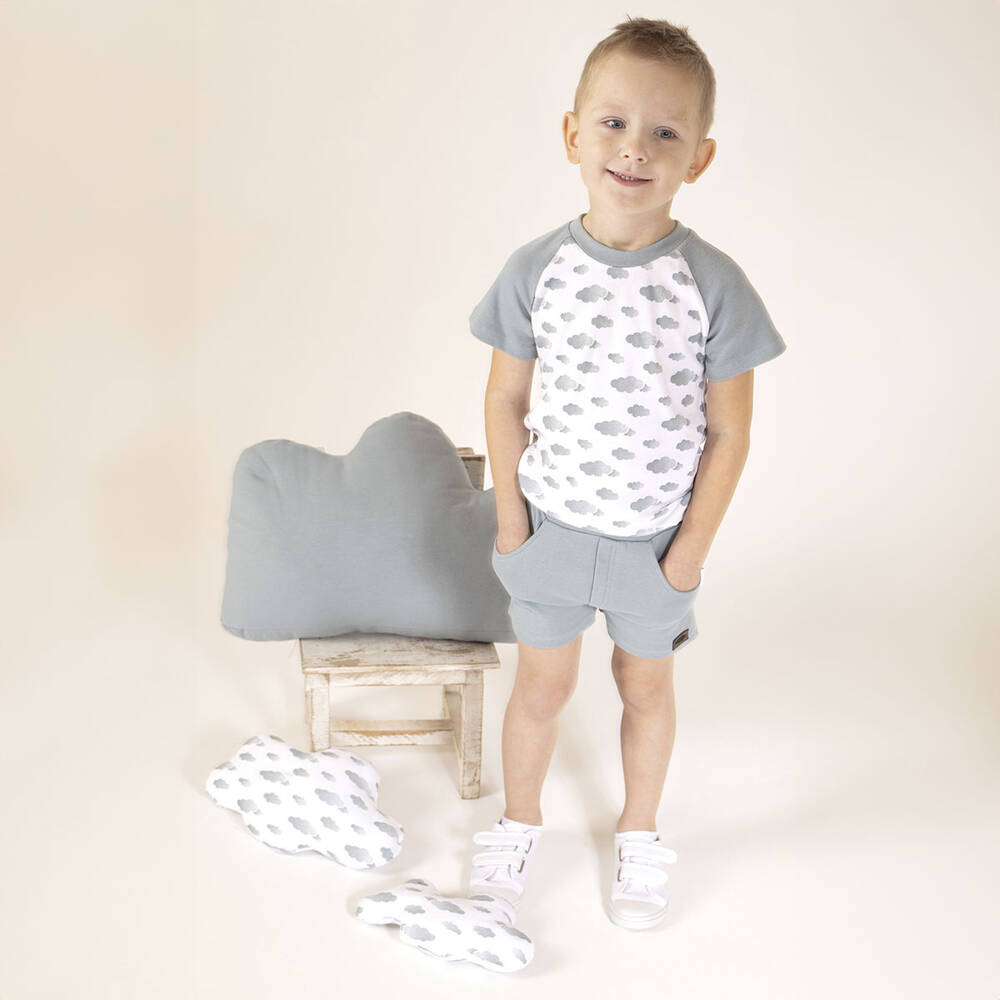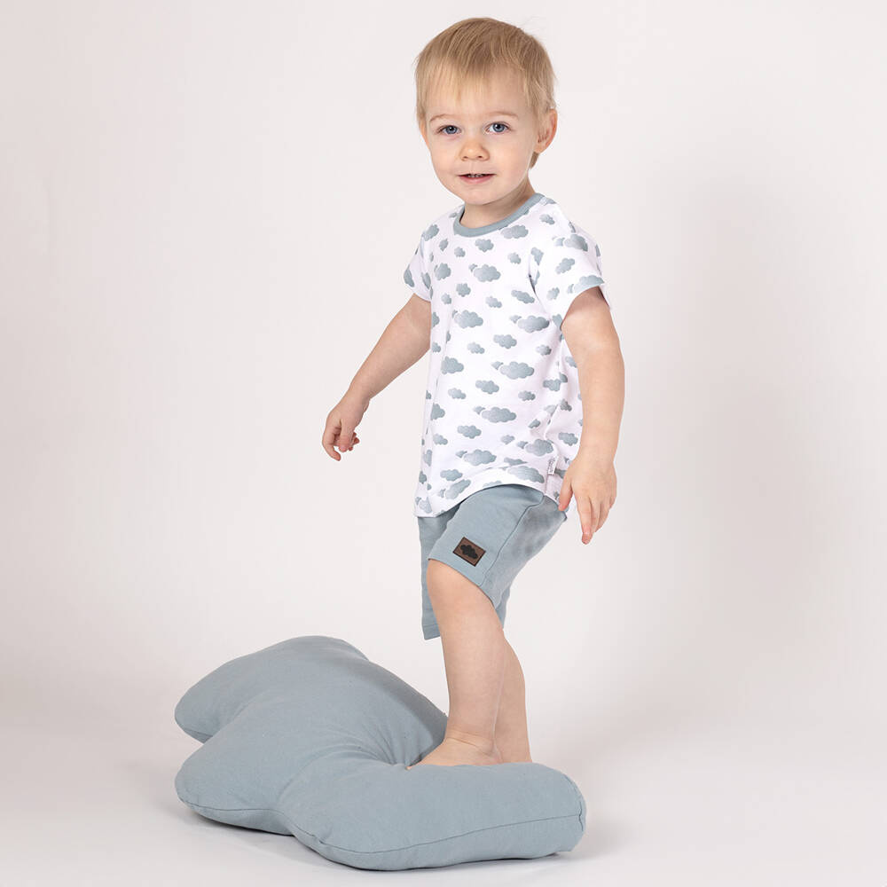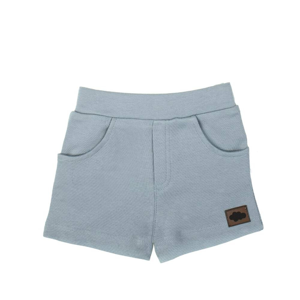 Zapytaj o produktKrótkie spodenki dla chłopca wykonane ze 100 % bawełny w kolorze lodowym. Materiał posiada certyfikat Oeko-Tex Standard 100 Tekstylia godne zaufania. W pasie posiadają bezuciskowy ściągacz z gumką. Na przodzie odszyta jest imitacja rozporka, którą dodatkowo zdobią drewniane guziczki. Dół nogawek jest odwijany, co dodatkowo podkreśla fason. Po lewej stronie doszyta została naszywka z chmurką.