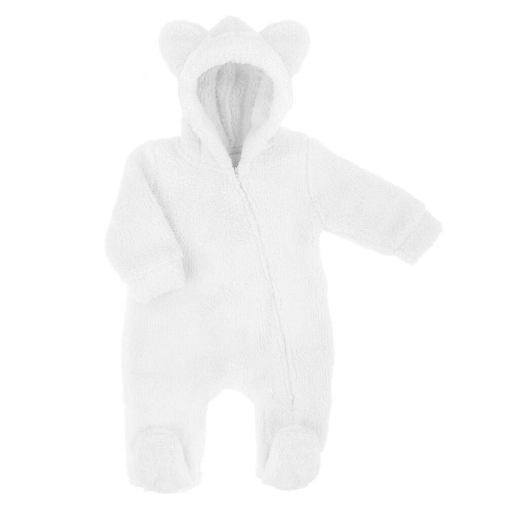 Pajac wykonany z ciepłej, białej luny. Idealny na chłodne dni. Całość zdobi kaptur z uszkami. Pajac zapinany na wygodny zamek - ułatwi to znacznie ubieranie dziecka. Materiał jest całkowicie bezpieczny dla skóry maluszka.