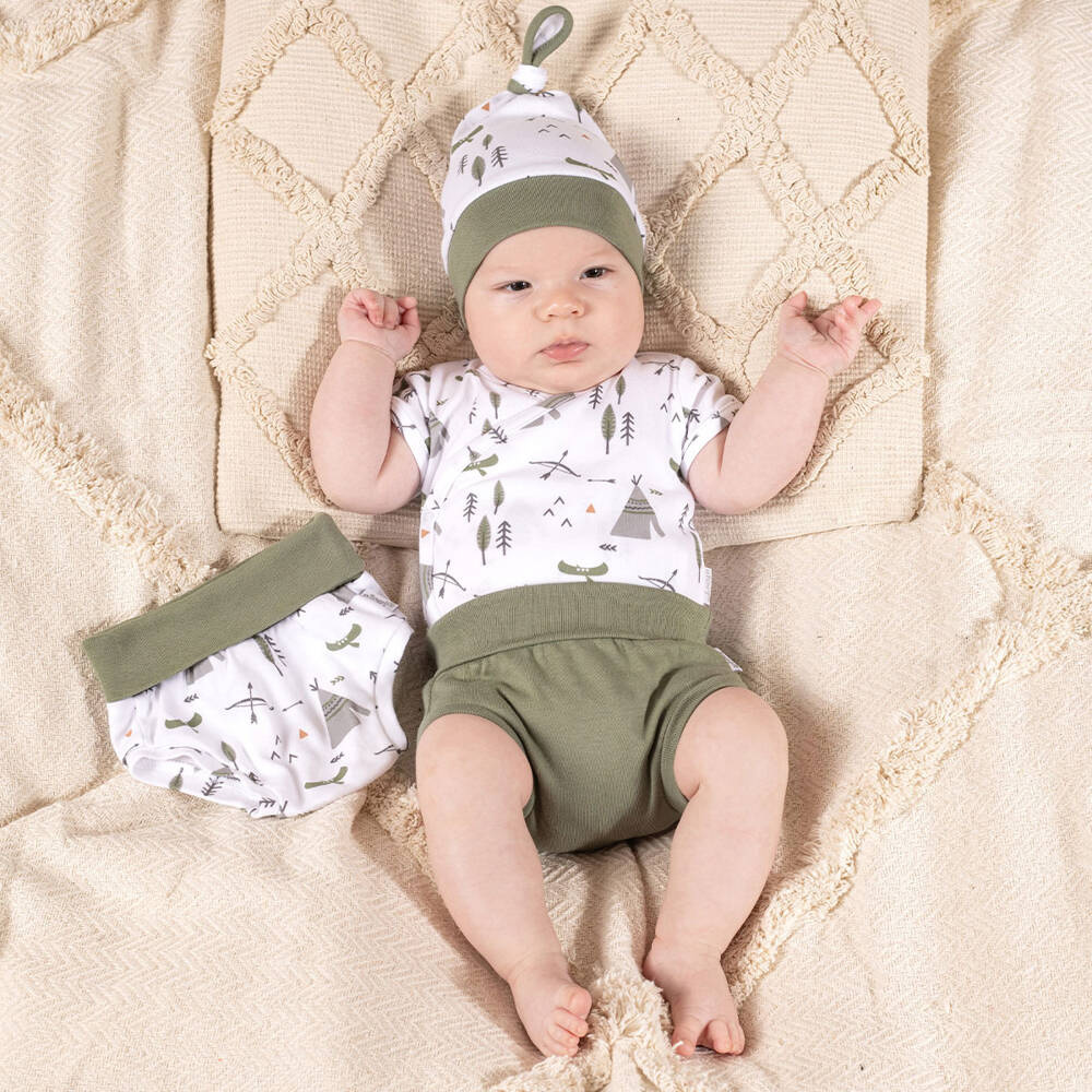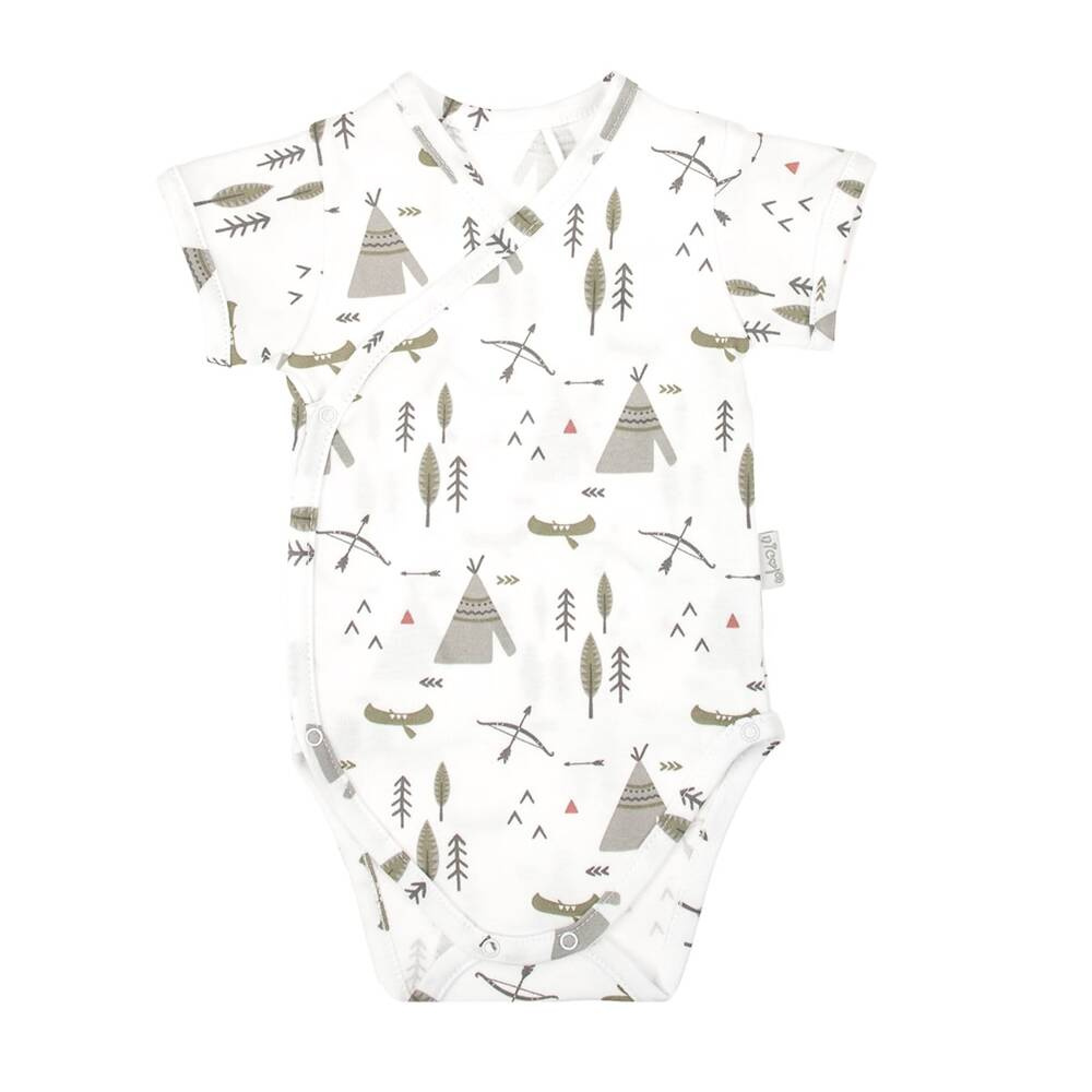 Zapytaj o produktKopertowe body z krótkim rękawem dla chłopca, idealne w ciepłe dni, uszyte z białej bawełny w indiański motyw. Materiał posiada certyfikat Oeko-Tex Standard 100 Tekstylia godne zaufania. Model ten polecany jest dla noworodków, ponieważ zastosowane zapięcie ułatwia ubieranie dziecka. Zapinane na bezniklowe napy.