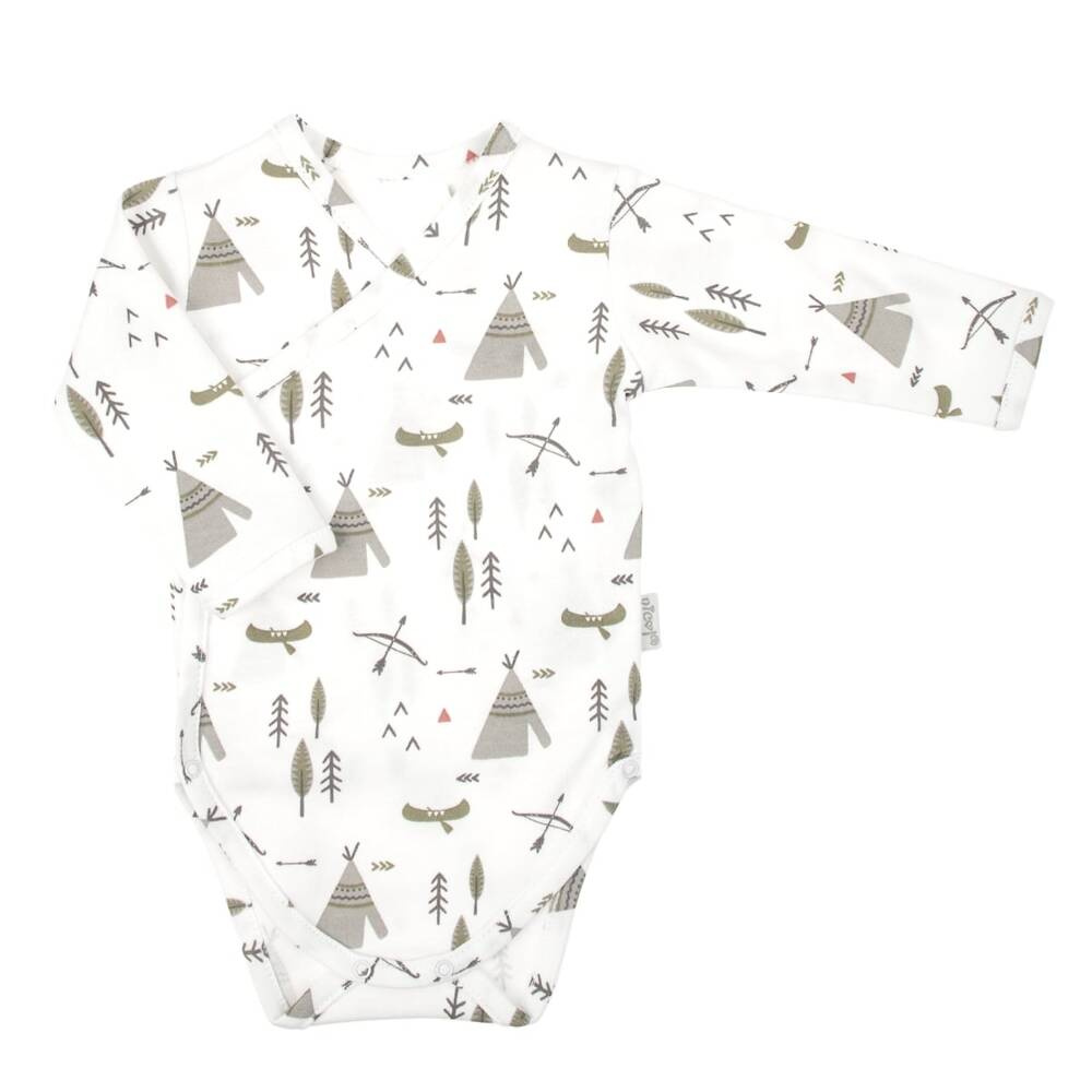 Zapytaj o produktKopertowe body z długim rękawem dla chłopca. Uszyte z białej bawełny w indiański motyw, posiadającej certyfikat Oeko-Tex Standard 100 Tekstylia godne zaufania. Model ten polecany jest dla noworodków, ponieważ zastosowane zapięcie ułatwia ubieranie dziecka. Zapinane na bezniklowe napy.
