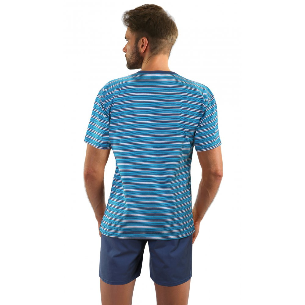 Piżama męska wzór 05 z krótkim rękawem i krótkimi spodenkami wykonana jest z wysokiej jakości bawełny. Składa się z koszulki w  modne paski, z nowocześnie wyglądającą kieszonką z guziczkiem, wykończona l amówką oraz z gładkich niezwykle wygodnych krótkich spodenek. Piżama idealna do spania oraz jako wygodny strój domowy.