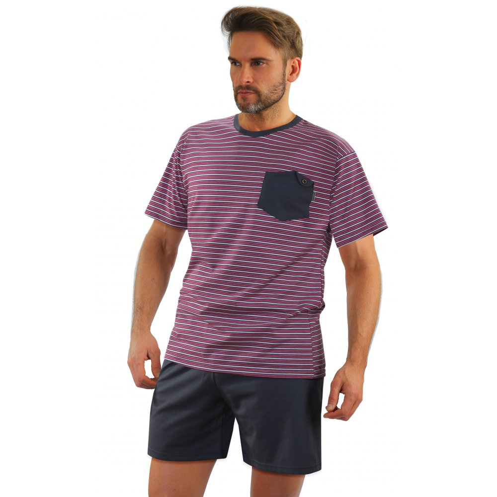 Piżama męska wzór 05 z krótkim rękawem i krótkimi spodenkami wykonana jest z wysokiej jakości bawełny. Składa się z koszulki w modne paski, z nowocześnie wyglądającą kieszonką z guziczkiem, wykończona l amówką oraz z gładkich niezwykle wygodnych krótkich spodenek. Piżama idealna do spania oraz jako wygodny strój domowy.