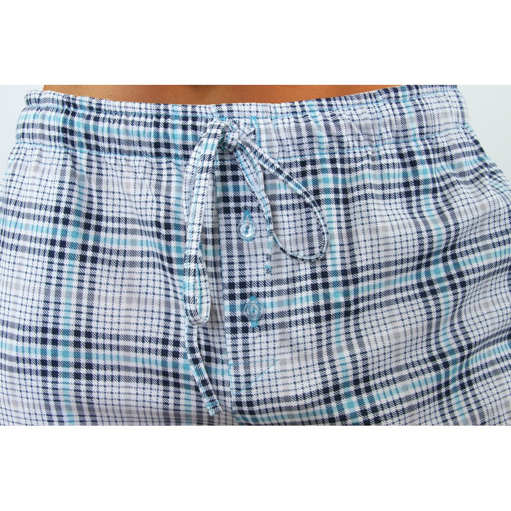 Piżama męska z długim rękawem i długimi spodniami. Wykonana jest z wysokiej jakości bawełny. Składa się z koszulki - T-shirt oraz spodni w modną kratkę, idealnie dobraną do koszulki. Spodenki mają w pasie szeroką gumę, dodatkowo ściągane są sznureczkiem, mają też rozporek z dwoma guziczkami a po bokach wygodne kieszenie. Całość tworzy modną i funkcjonalną piżamę i wygodny strój domowy.