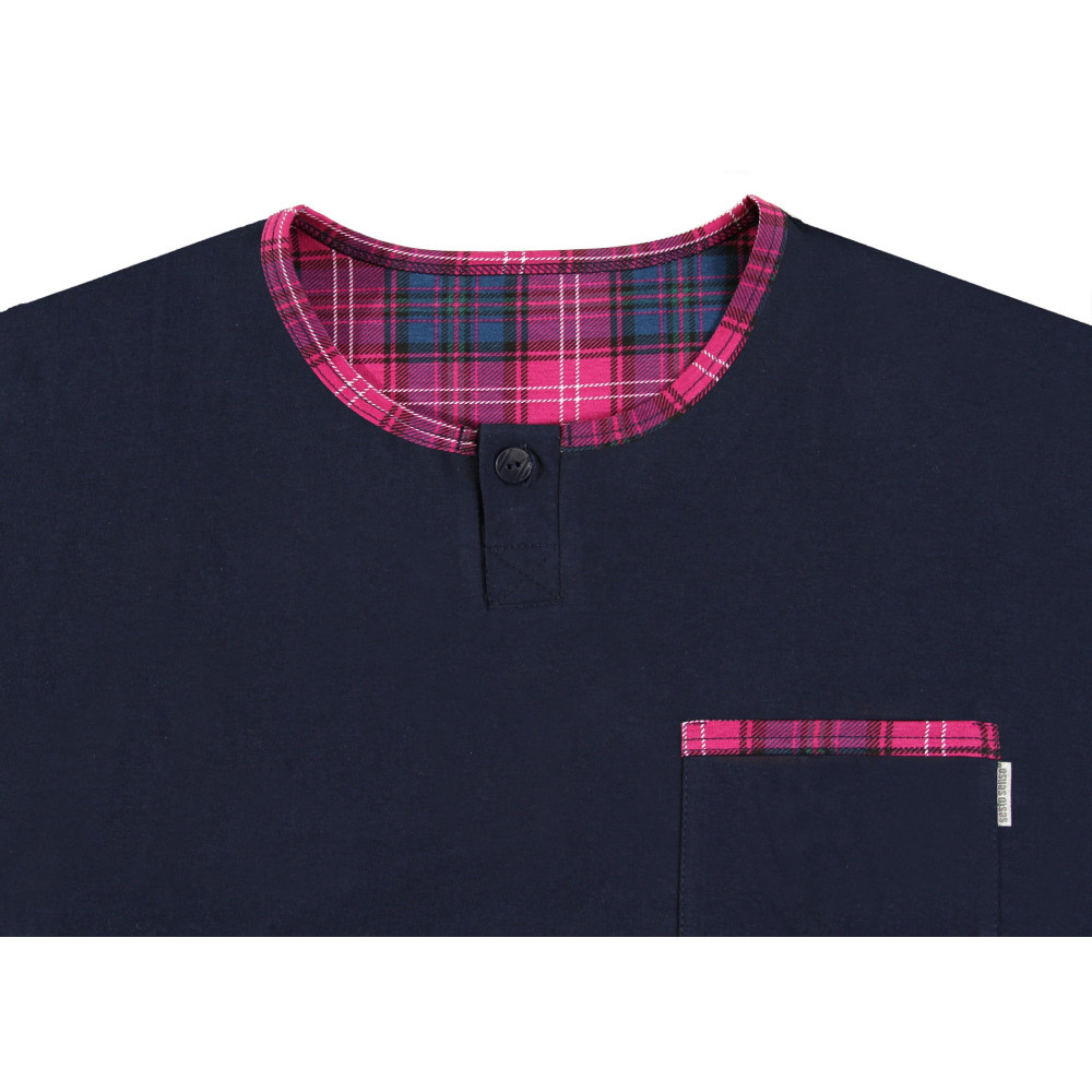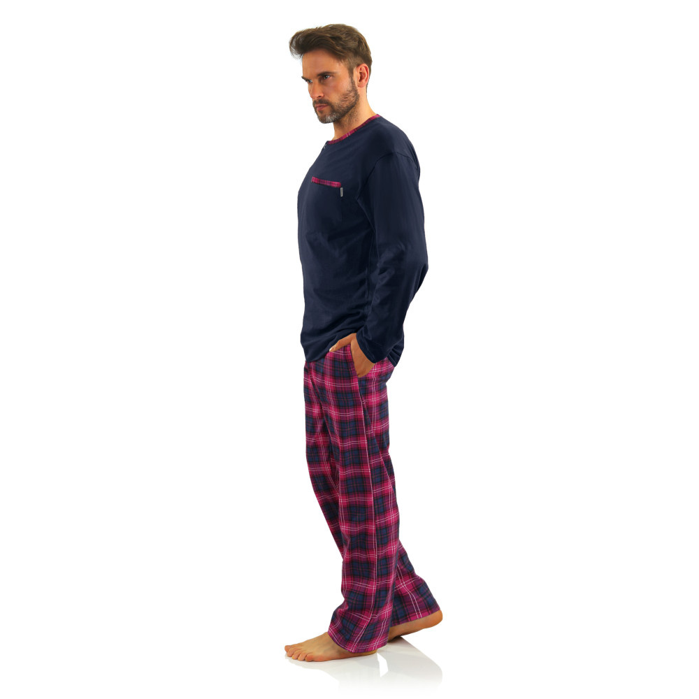 Piżama męska z długim rękawem i długimi spodniami. Wykonana jest z wysokiej jakości bawełny. Składa się z koszulki - T-shirt oraz spodni w modną kratkę, idealnie dobraną do koszulki. Spodenki mają w pasie szeroką gumę, dodatkowo ściągane są sznureczkiem, mają też rozporek z dwoma guziczkami a po bokach wygodne kieszenie.