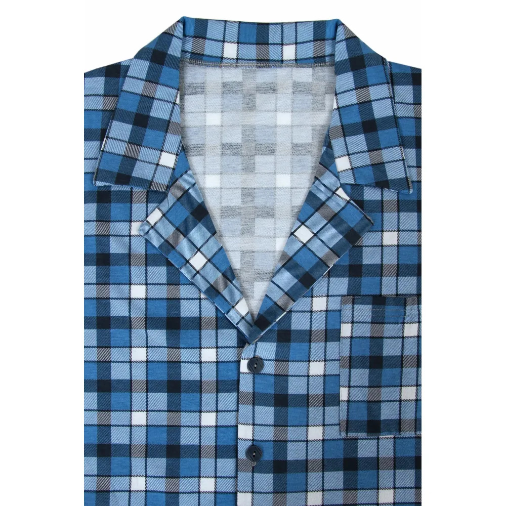 Wygodna i praktyczna piżama męska rozpinana, wykonana z najwyższej jakości bawełny. Bluza o klasycznym kroju z kołnierzykiem, zapinana na guziki, posiada praktyczne kieszonki umieszczone u dołu oraz na piersi, obszyte lamówką. Krótkie spodenki mają w pasie szeroką gumę, dodatkowo ściągane są sznureczkiem, mają też rozporek z dwoma guziczkami a po bokach kieszenie. Wygodny krój, aktualna modna kolorystyka, jakość wykonania, gwarantują wygodę użytkowania. Idealna zarówno do spania jak i do chodzenia po domu. Świetnie nadaje się na prezent, jest zapakowana w eleganckie pudełko. Wyprodukowane w Polsce.