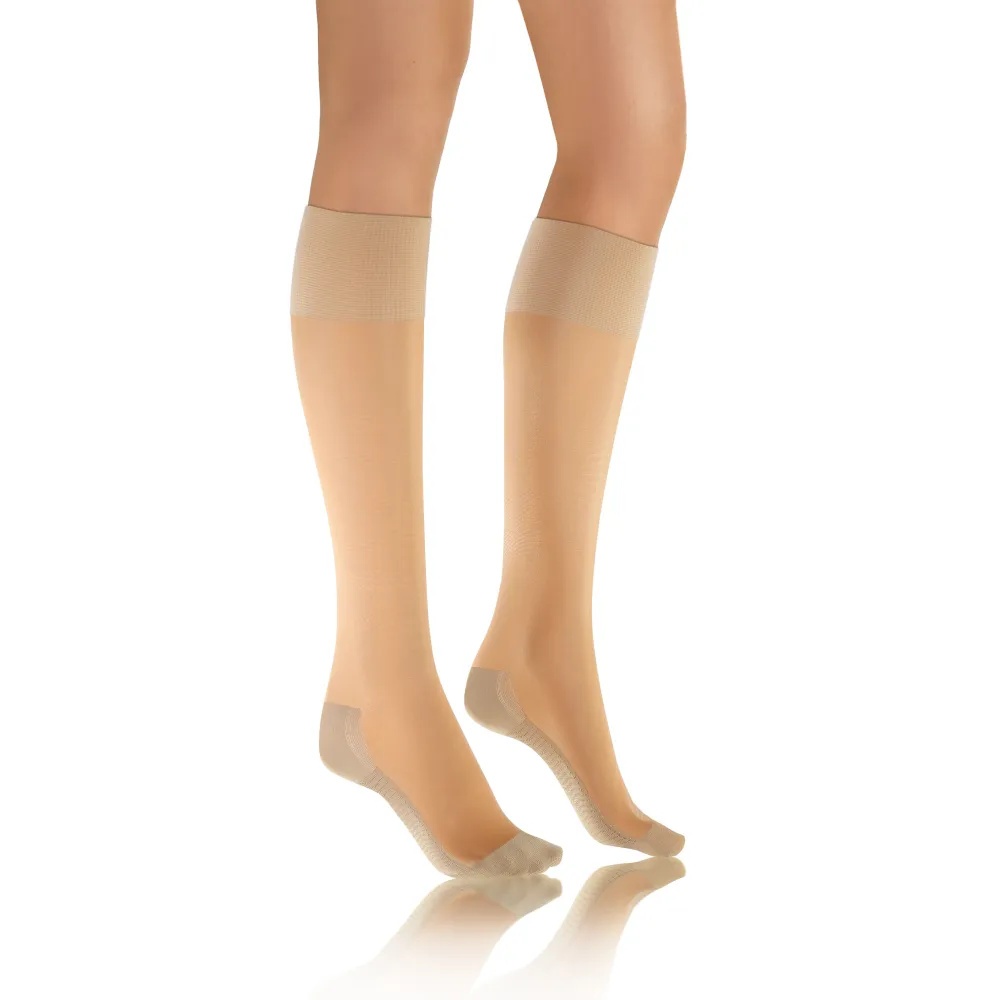 Podkolanówki z profilaktycznym efektem masażu stóp i bez uciskowym ściągaczem. Grubość 20 Den. Nie uciskają, są półmatowe, przezroczyste. Specjalna technologia ułożenia materiału w okolicach spodu stopy sprawia, że doświadczamy efektu delikatnego masażu stóp. Idealnie sprawdzają się do biura, ale też u osób, które mają kłopoty z krążeniem.