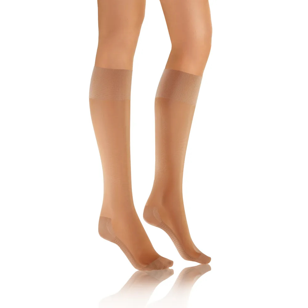 Podkolanówki z profilaktycznym efektem masażu stóp i bez uciskowym ściągaczem. Grubość 20 Den. Nie uciskają, są półmatowe, przezroczyste. Specjalna technologia ułożenia materiału w okolicach spodu stopy sprawia, że doświadczamy efektu delikatnego masażu stóp. Idealnie sprawdzają się do biura, ale też u osób, które mają kłopoty z krążeniem.