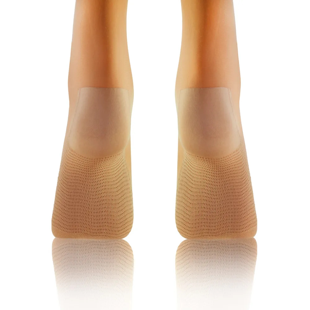 Podkolanówki z profilaktycznym efektem masażu stóp i bez uciskowym ściągaczem. Grubość 20 Den. Nie uciskają, są półmatowe, przezroczyste. Specjalna technologia ułożenia materiału w okolicach spodu stopy sprawia, że doświadczamy efektu delikatnego masażu stóp. Idealnie sprawdzają się do biura, ale też u osób, które mają kłopoty z krążeniem.