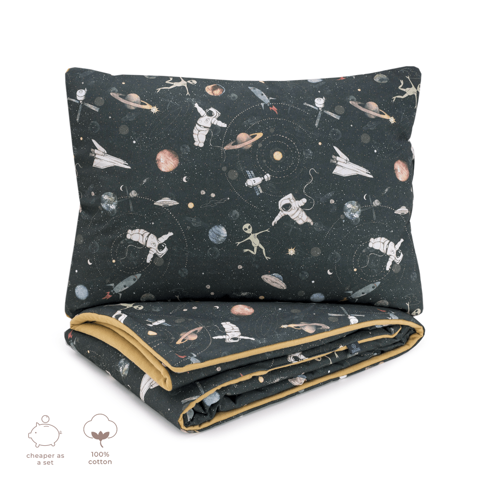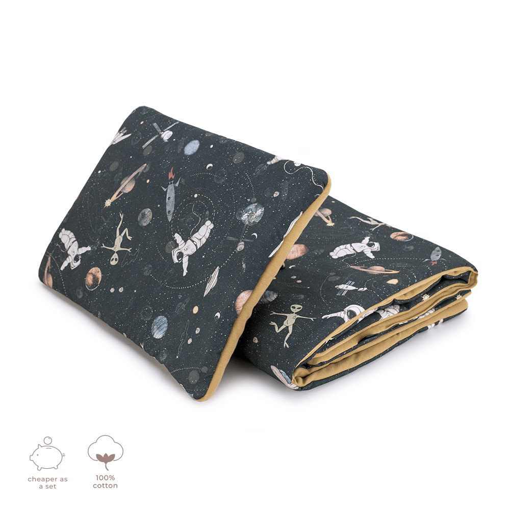Jedna strona, wykonana jest z najwyższej jakości płótna bawełnianego w autorski wzór. Druga strona, to mięciutka i delikatna dzianina bawełniana przyjazna delikatnej skórze dziecka.
