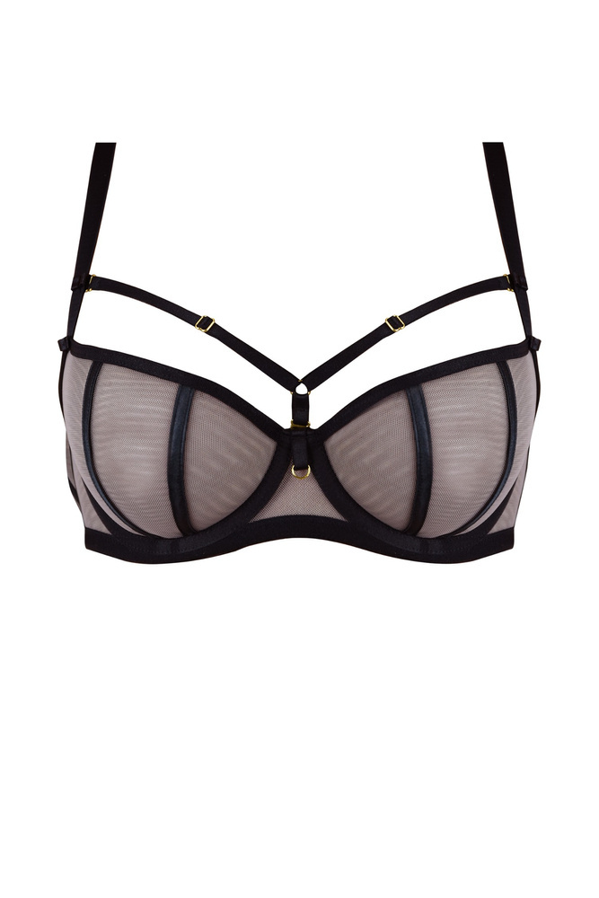 Biustonosz o kroju balkonetki. Miseczki są wykonane z siatki, satynowe lamówki przykrywają pionowe cięcia. Ozdobne paseczki ozdobią dekolt, odpinają się. Konstrukcja doskonale wyeksponuje biust.
