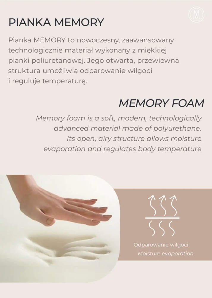 Pianka Memory Foam to nowoczesny, technologicznie zaawansowany materiał wykonany z miękkiej pianki poliuretanowej. Jej otwarta, przewiewna struktura pozwala na wyparowanie wilgoci i regulację temperatury, nie wywiera nacisku na punkty kontaktowe ciała, ale dopasowuje się do nich optymalnie podpierając ciało, co jest idealne dla maluszków z zespołem napięcia mięśniowego.