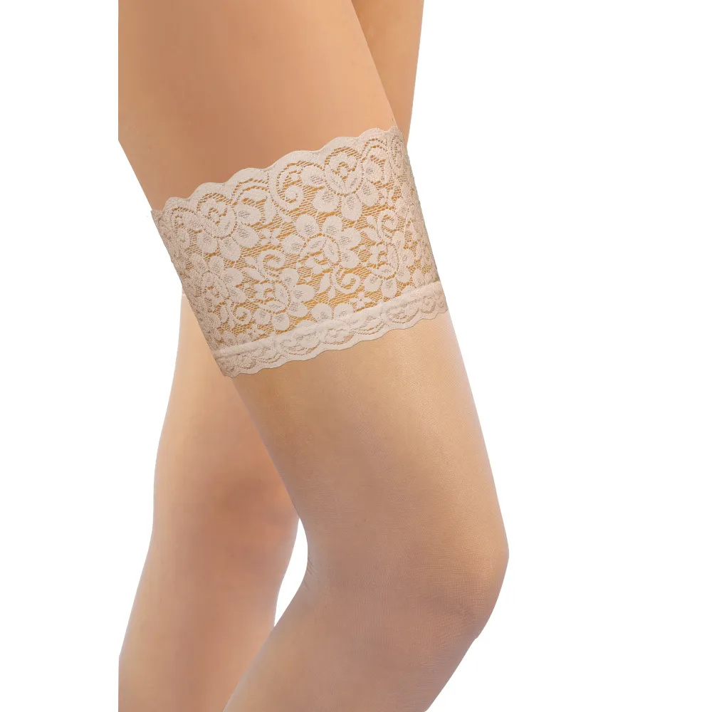 Bardzo cienkie pończochy samonośne, które idealnie trzymają się na nogach. Przezroczyste z efektem bosej stopy.