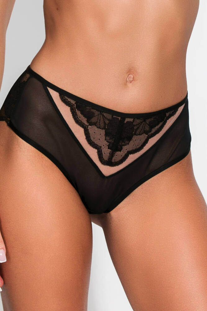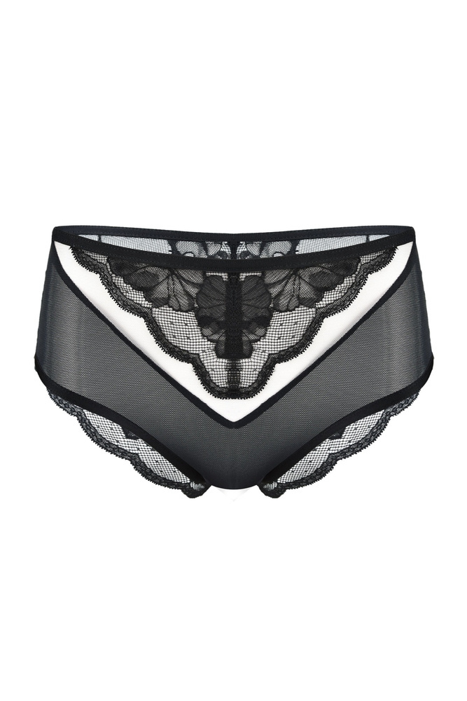 Figi brazyliany. Tył całego modelu jest ozdobiony koronką, dodając mu delikatny i kuszący wygląd. Koronkowe zdobienia nadają mu subtelnego uroku i elegancji, sprawiając, że nosząca je kobieta czuje się wyjątkowo i pewnie.