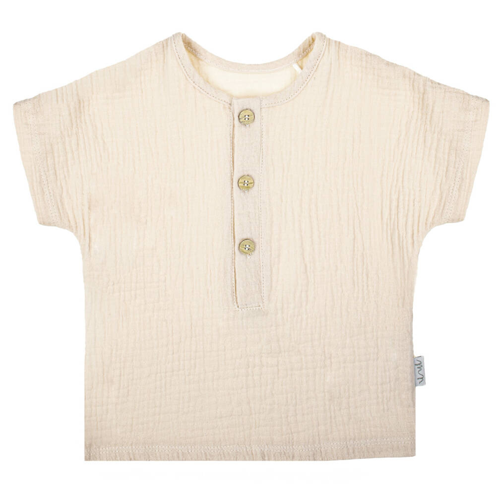 Praktyczna bluzeczka dla chłopca. Wykonana z muślinowej tkaniny, w skład której wchodzi 100% bawełny. Produkt  zdobi zapięcie typu polo zapinane na ozdobne guziki.