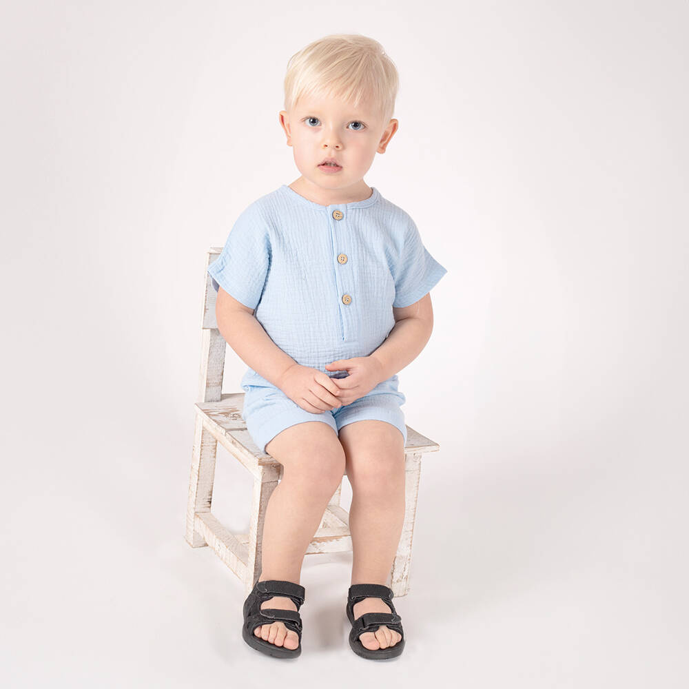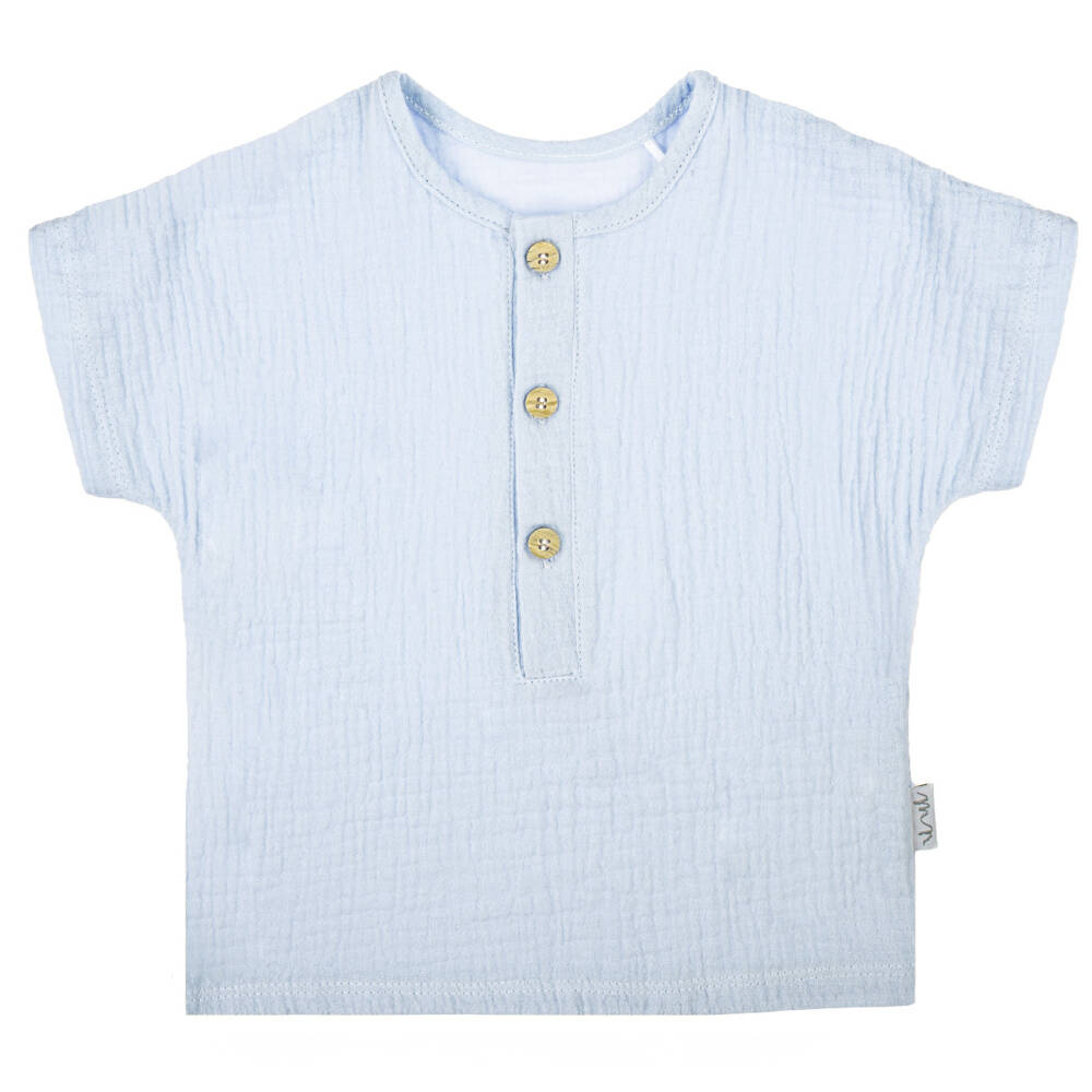 Praktyczna bluzeczka dla chłopca. Wykonana z muślinowej tkaniny, w skład której wchodzi 100% bawełny. Produkt  zdobi zapięcie typu polo zapinane na ozdobne guziki.