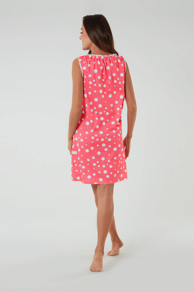 Koszula nocna z krótkim rękawem i efektownym nadrukiem w grochy. Posiada klasyczny fason, który idealnie sprawdzi się nawet podczas upalnych nocy. Okrągły dekolt wykończony został falbanką z gumką, dzięki czemu jest również świetną koszulą nocną do karmienia. Przy dekolcie, na środku, znajduje się ozdobna, atłasowa kokardka. Same ramiączka również zostały wykończone falbanką. Nasza koszula nocna z bawełny jest miękka, przewiewna, a jednocześnie wytrzymała. Dzięki temu świetnie sprawdzi się przez wiele sezonów.