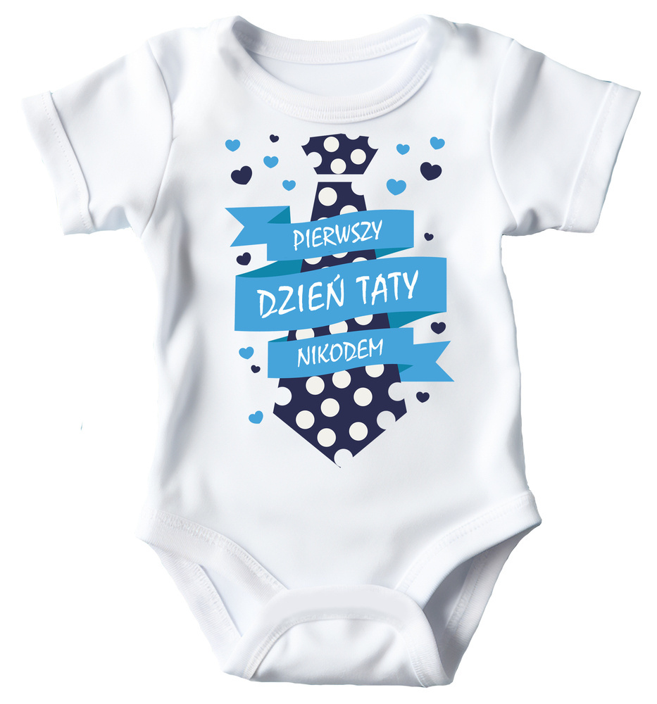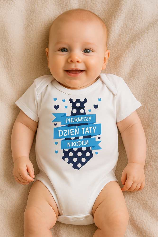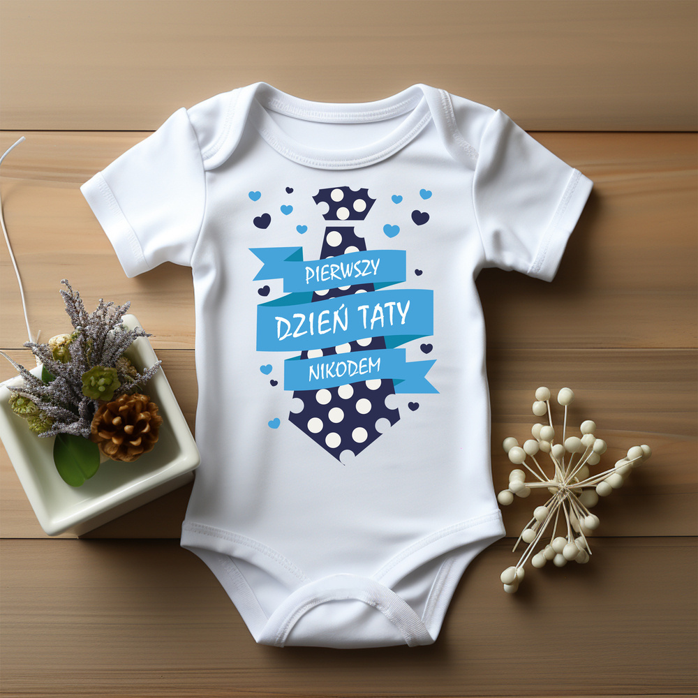 SKU A033 "Mój PIERWSZY Dzień Taty z imieniem dla chłopca" Body krótki rękaw Moocha biały