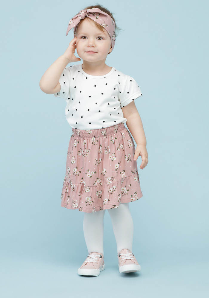 Dziewczęca spódniczka w kolekcji Tres Bien uszyta została z delikatnej i przewiewnej tkaniny wiskozowej ozdobionej kwiatuszkami. Ozdobna, marszczona falbana dodaje jej dziewczęcego uroku i zwiewności. W pasie wszyta została delikatna gumka, która utrzymuje spódnicę w odpowiednim miejscu, ale nie uciska dziewczynki w brzuszek. Warto pamiętać o spódniczce kompletując garderobę dla swojej córeczki. Sprawdzi się na co dzień oraz wyjątkowe okazje, na przykład przyjęcia czy akademie w przedszkolu. Spódnica, podobnie jak wszystkie ubranka Pinokio, wyprodukowana jest w Polsce. Modelka na zdjęciu ma 88cm wzrostu i nosi rozmiar 92.