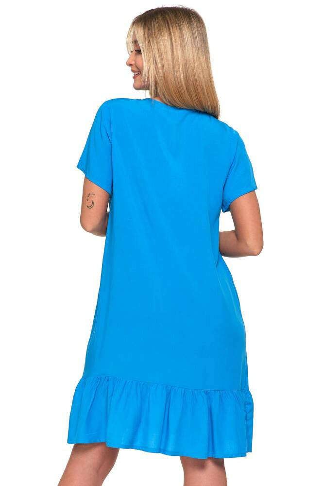 Ten elegancki model jest wyrazem bezpretensjonalnej elegancji, idealny dla każdej kobiety, która ceni sobie prostotę połączoną z subtelnym, kobiecym akcentem. Prosty krój sukienki zapewnia ponadczasowy wygląd, a jej luźna forma gwarantuje maksimum komfortu.