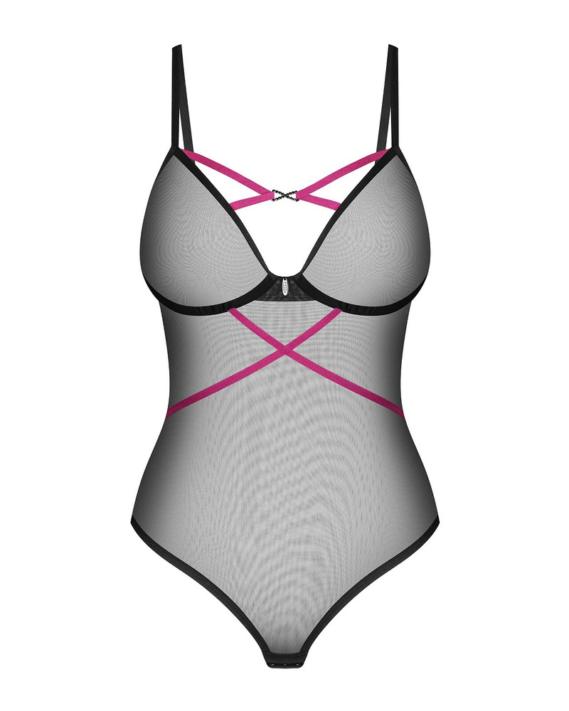 Kuszące body uszyte z myślą o pewnych siebie kobietach. Prześwitująca tkanina dopasuje się do każdego rodzaju sylwetki. Błyszczące elementy i fioletowe paski przełamują czarny kolor bielizny.