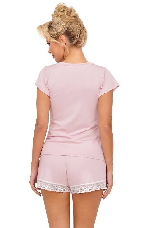 Piżama damska wykonana z delikatnej wiskozy. Koszulka z krótkim rękawem i dekoltem w kształcie litery ,,V". Do kompletu luźne, wygodne szorty zakończone koronką.