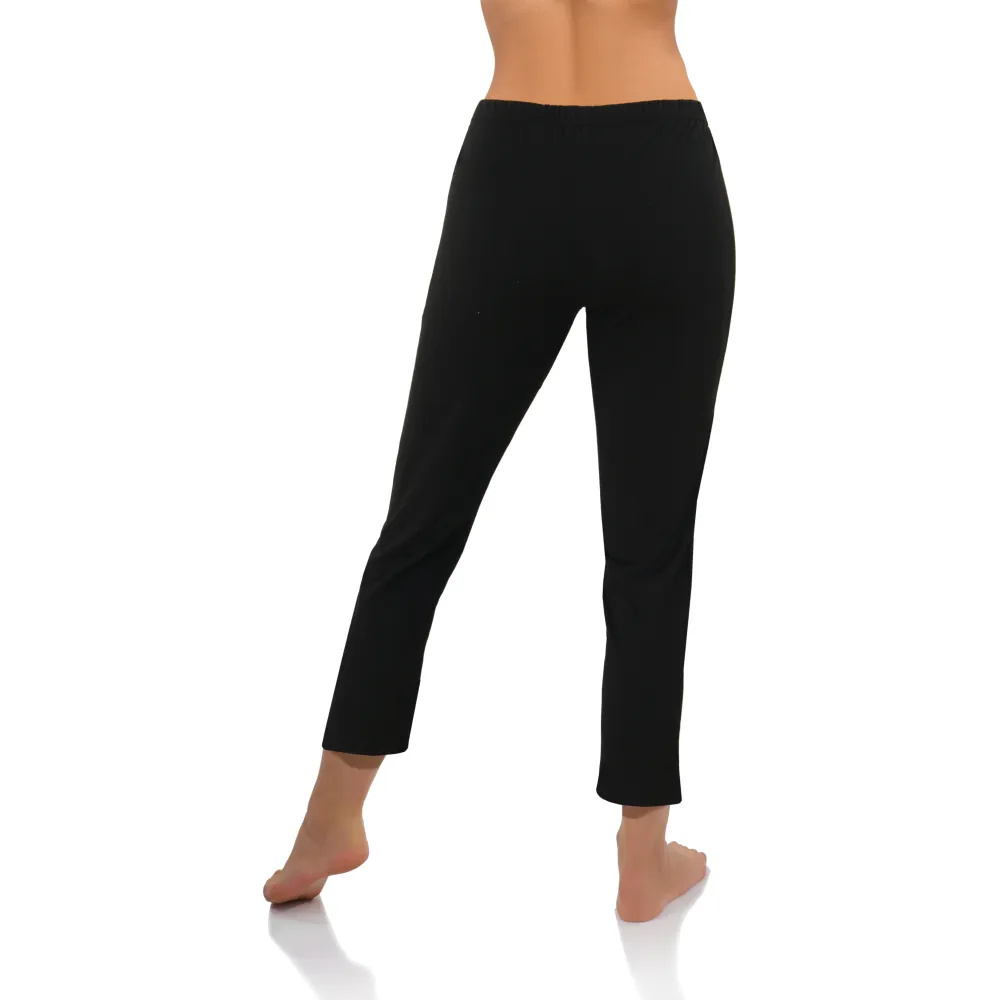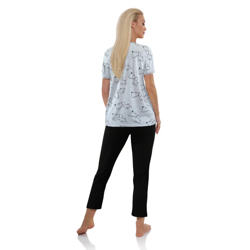 Wygodna i miękka w dotyku piżama z krótkim rękawem i spodniami długości 3/4. Koszulka z okrągłym dekoltem w motyw z pieskami oraz gładkie czarne spodnie Przemyślany krój zapewnia komfort użytkowania i sprawia, że komplet wygląda wspaniale na każdej sylwetce. Idealna do spania ale też jako praktyczny strój domowy.